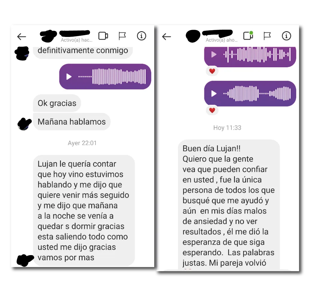 sin manipular, ni forzar, con acompañamiento real durante el proceso en este acceso el ritual lo hara Lujan por vos eso, se ve en la evaluación previa, con el método lujan tenes acceso inmediato al ritual de retorno de pareja, a clases grabadas con meditaciones, ejercicios y todas las herramientas necesarias para recuperar a tu persona especial.