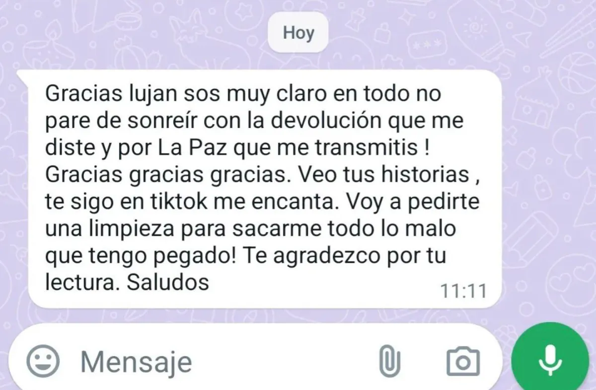 No tengan dudas, Luján es una persona de mucha sabiduría, es increíble todo, me ayudo y estuvo siempre a cada momento, Estoy muy feliz, no duden en consultar muy recomendable!!!