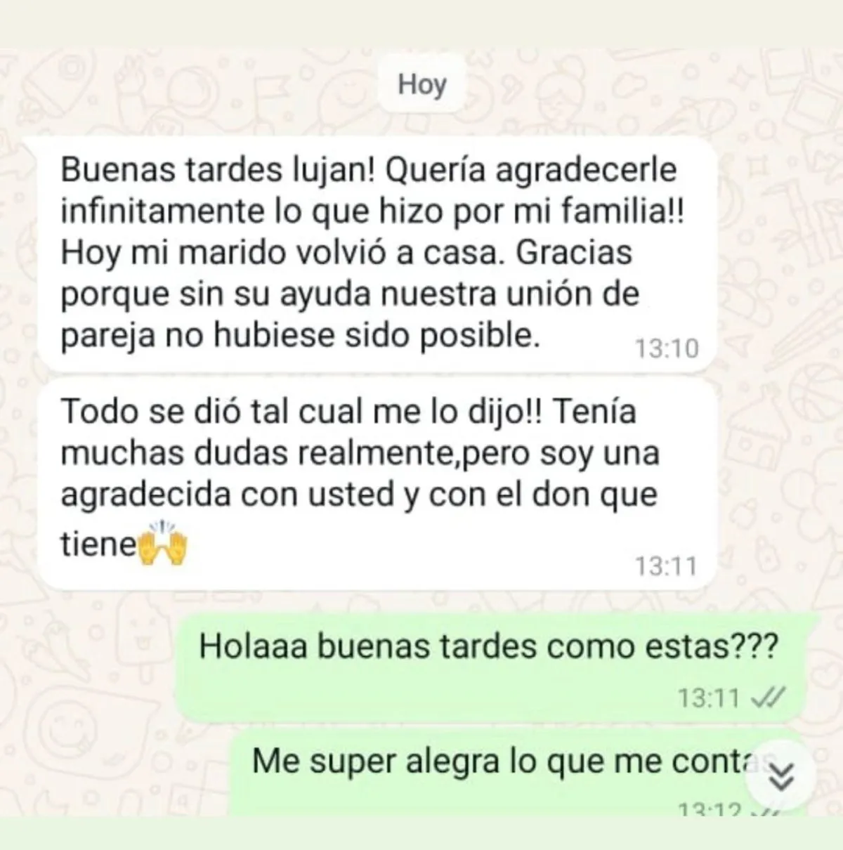 Hola Luján. Muchas gracias por tu ayuda. Me costó creer al principio pero todo salió como esperaba! Mi familia volvió a ser unida como antes.